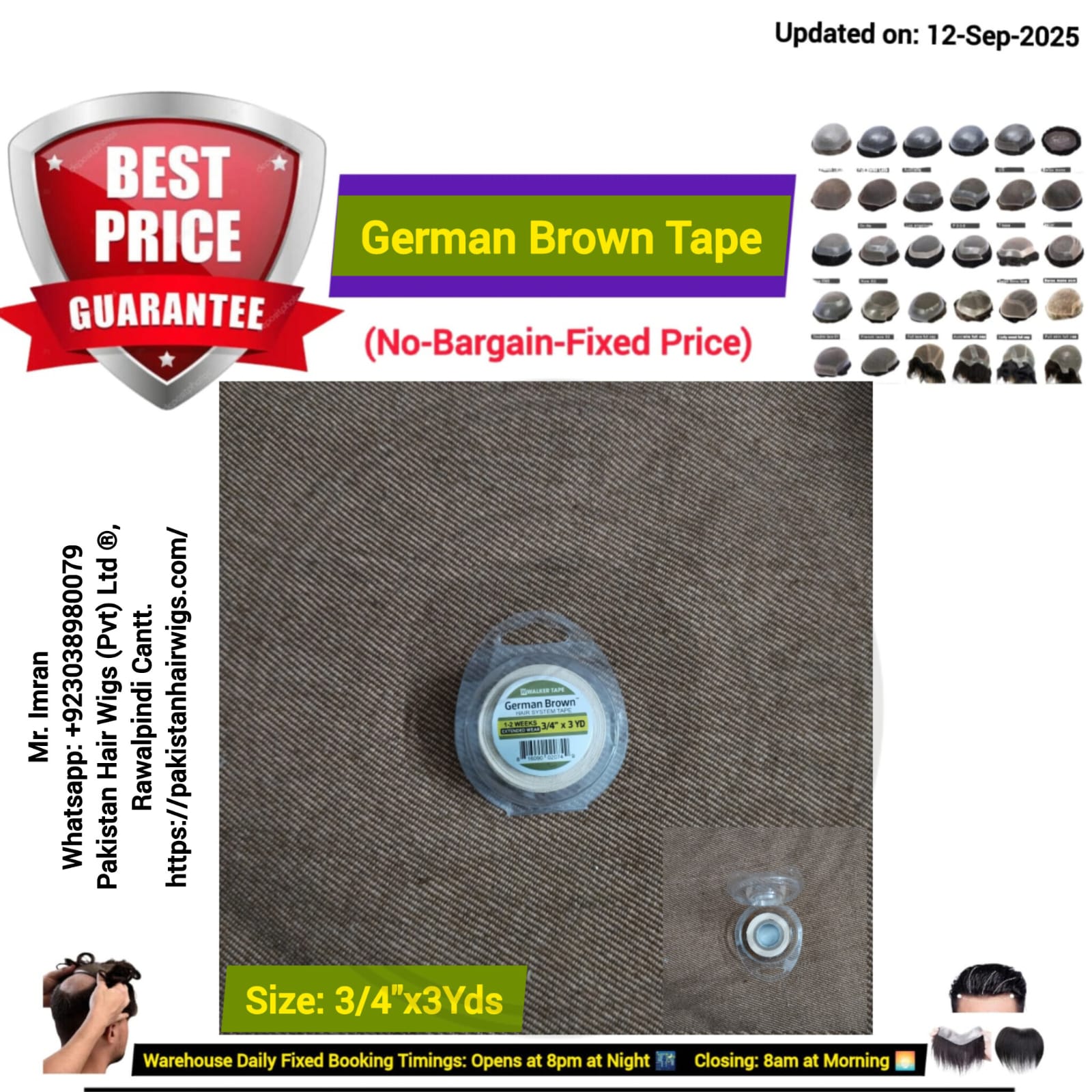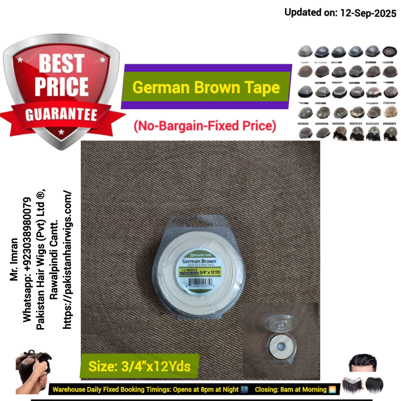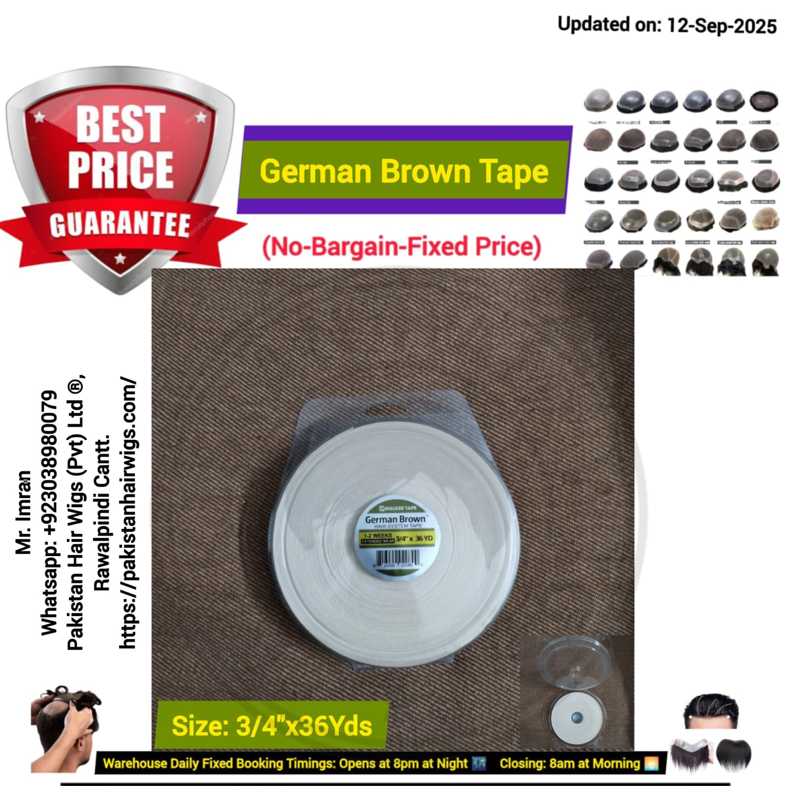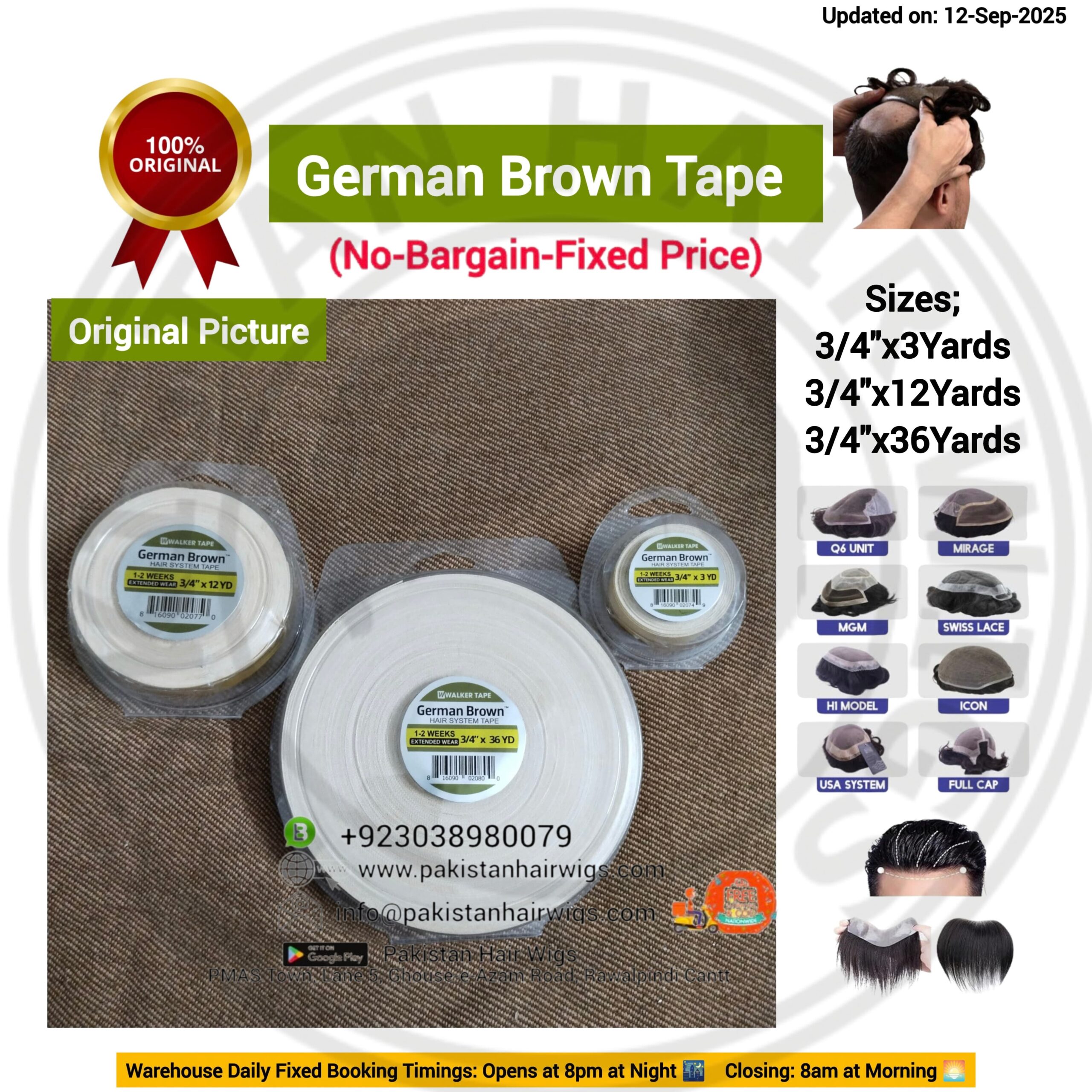 Details: Size: 1 inch x 8 Yards= (24 Feet) Wide= 1 inch Length= 24 FeetHighGrip Hair Wig Tape (Non-Melting) & (Re-Useable Tape)
